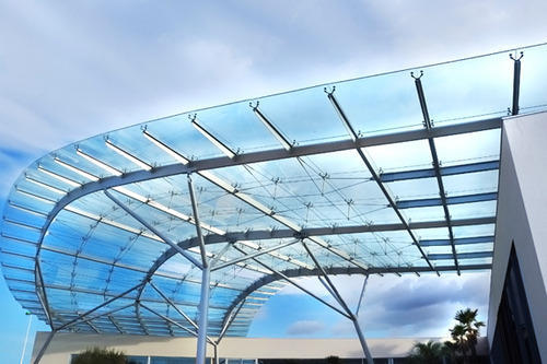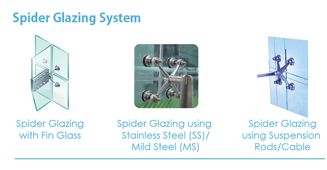 Spider glazing done with fin glass toughened glass or laminated glass to act as a structural support to with stand wind pressure, internal pressure and dead weight. It can be done either on the top the glazing or in the bottom with the support of fin plates mad of stainless steel.